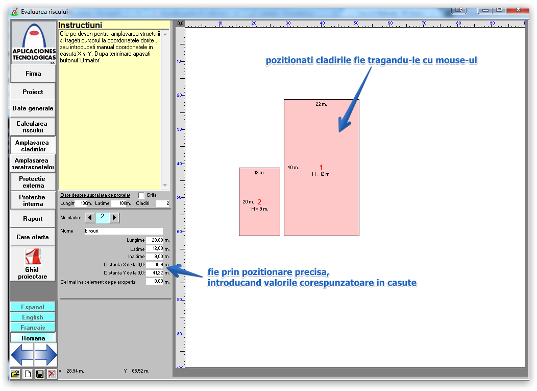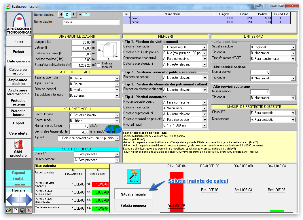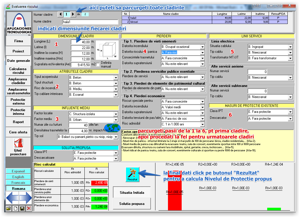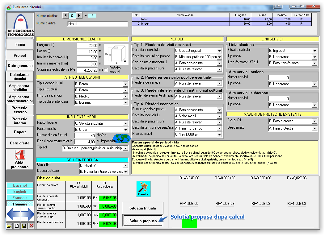 In continuare parcurgeti toate meniurile din partea stanga, si amplasati cladirile, paratrasnetele, protectia externa, protectia interna, completand tot ce vi se cere in fiecare meniu, dupa care in meniul "Cerere Oferta" aveti posibilitatea de a atasa, planuri de situatie, imagini, proiect, etc. care sa ne ajute in elaborarea unei oferte cat mai precise.